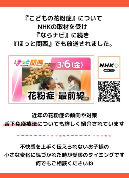 2026.03.09 メディア情報 お知らせ 番組放送のご案内『ほっと関西』 2026年3月6日 18時10分~ NHKの取材を受け『ならナビ』 に続き 『ほっと関西』でも花粉症の診察状況が放送されました。 番組では舌下免疫療法なども紹介されています。 当クリニックでも舌下免疫療法など花粉症の相談を受付ています。
